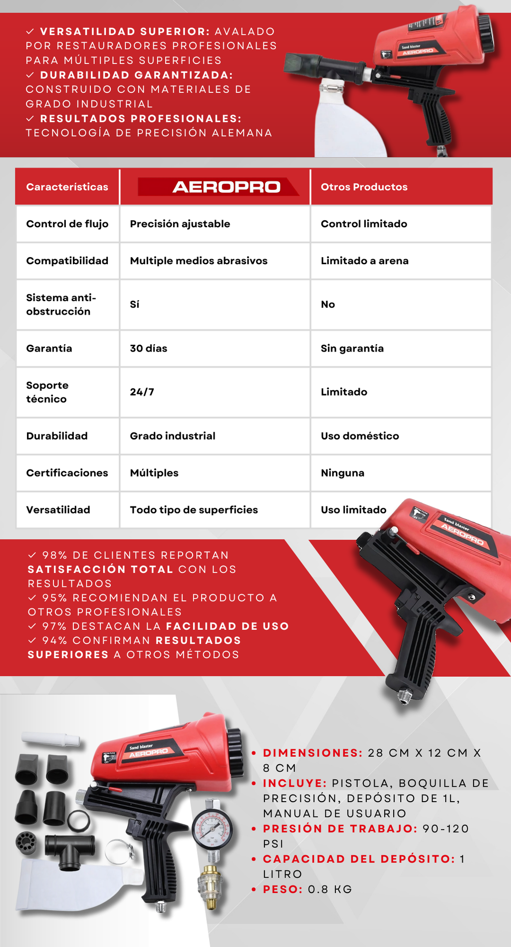 Revoluciona tus proyectos de restauración y limpieza con AEROPRO, la herramienta definitiva para tratamientos de superficies profesionales. Esta pistola de arena de alta precisión elimina óxido, pintura y residuos difíciles con facilidad, transformando superficies deterioradas en acabados impecables en minutos.